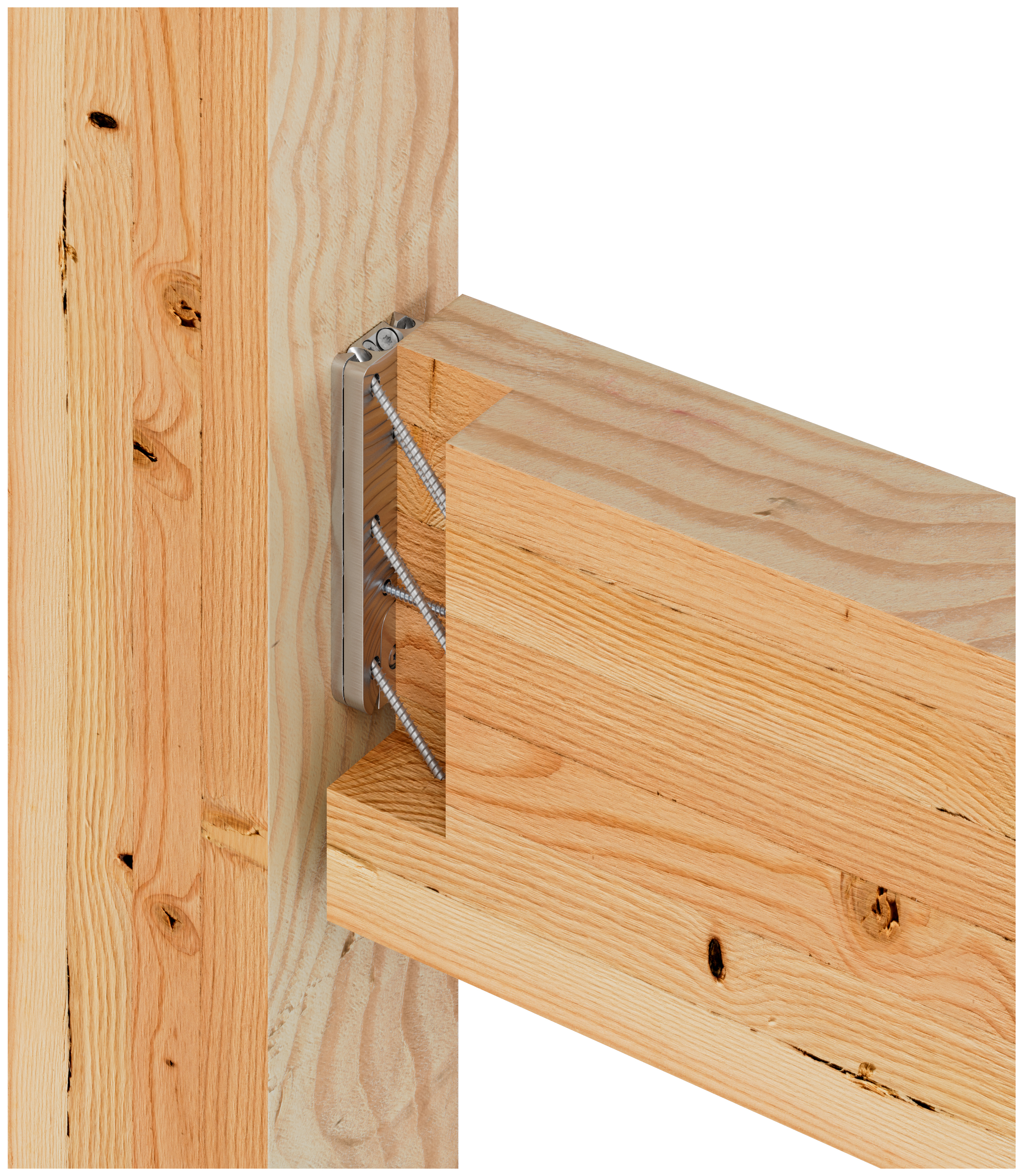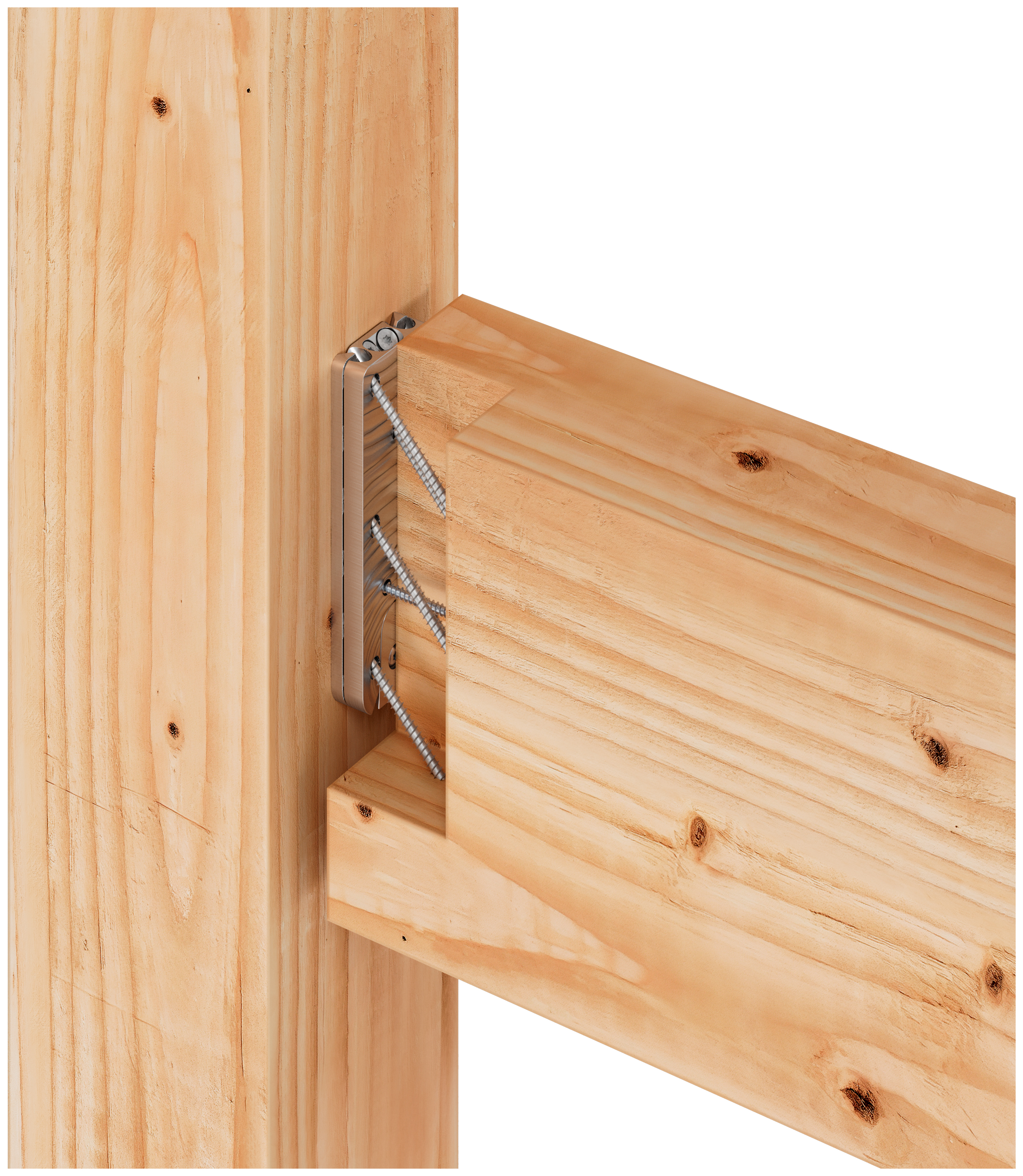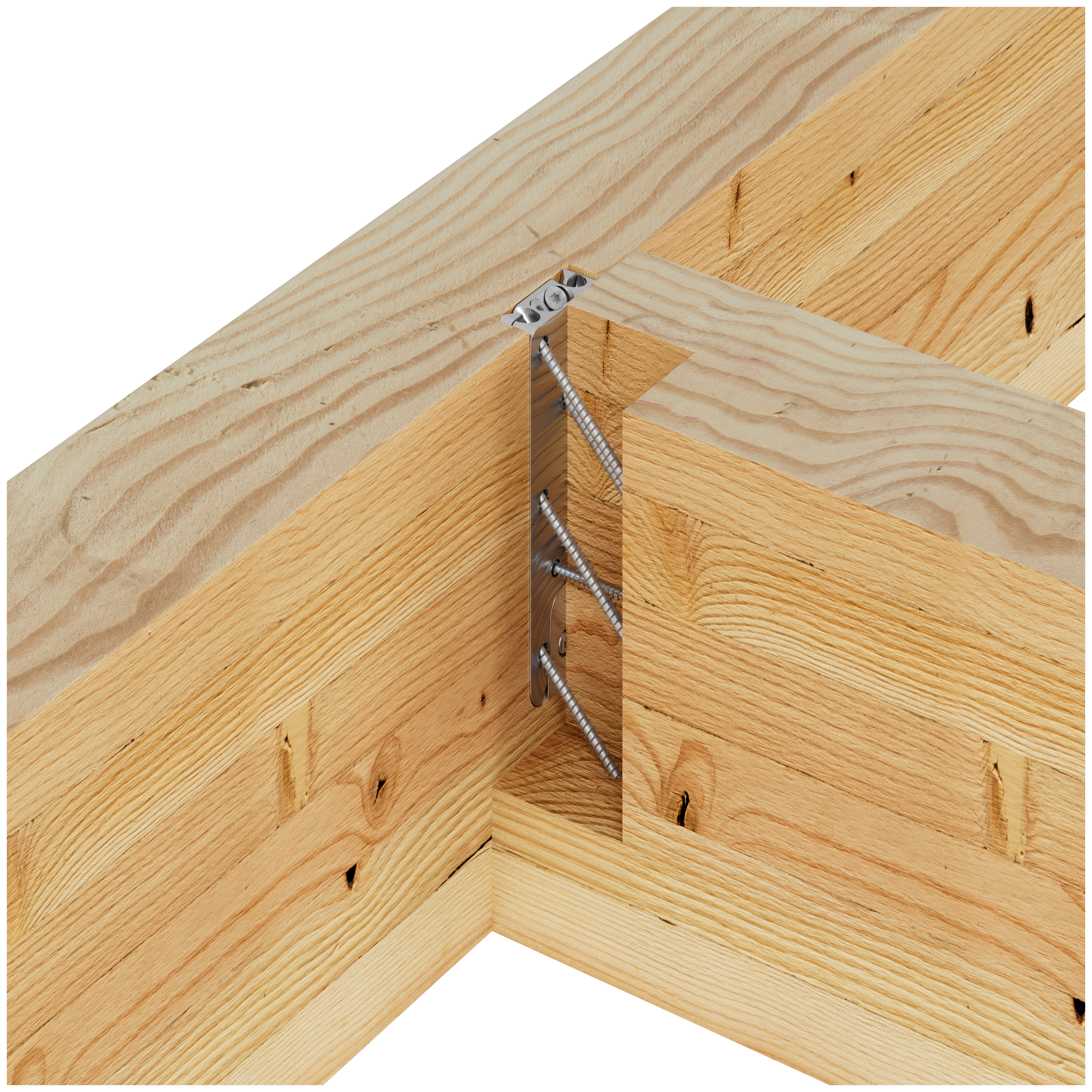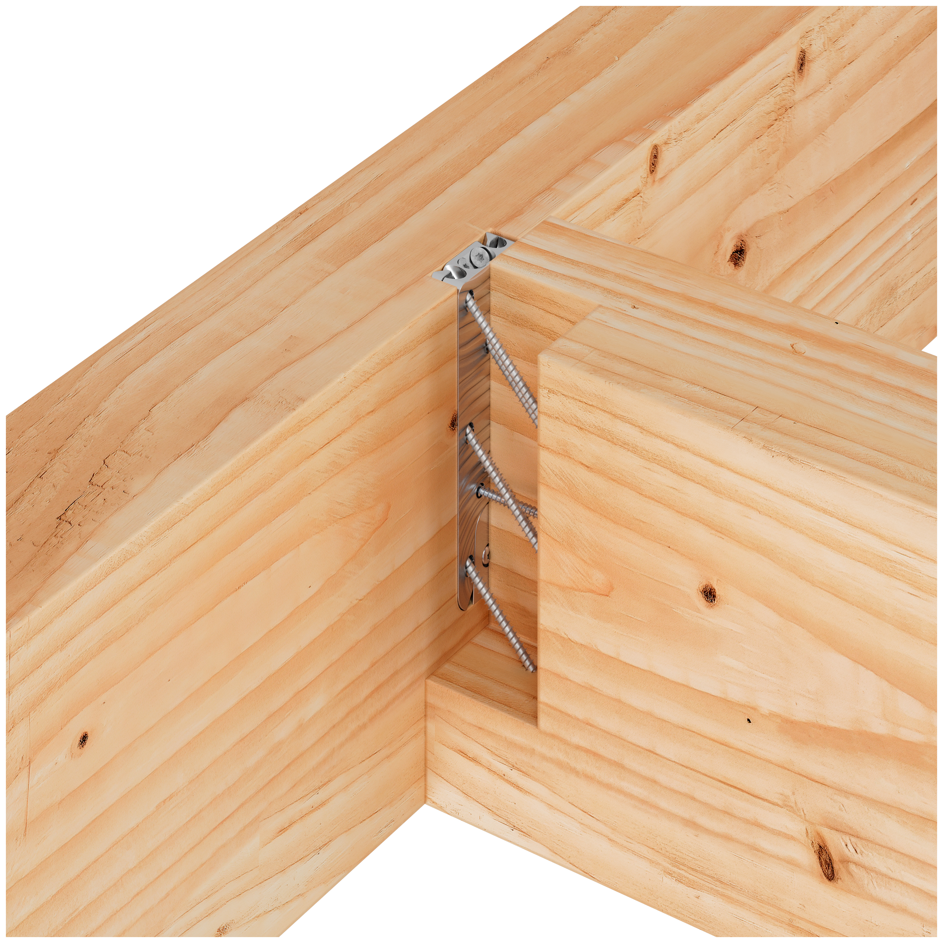 Der innenliegende, zweiteilige Hirnholzverbinder wird mit Schattenfuge oder ganz verdeckt montiert. Er eignet sich für Hauptträger-Nebenträger- ebenso wie für Pfosten-Riegel-Anschlüsse. Die Befestigung erfolgt mit unseren optimierten CSFT Vollgewindeschrauben.