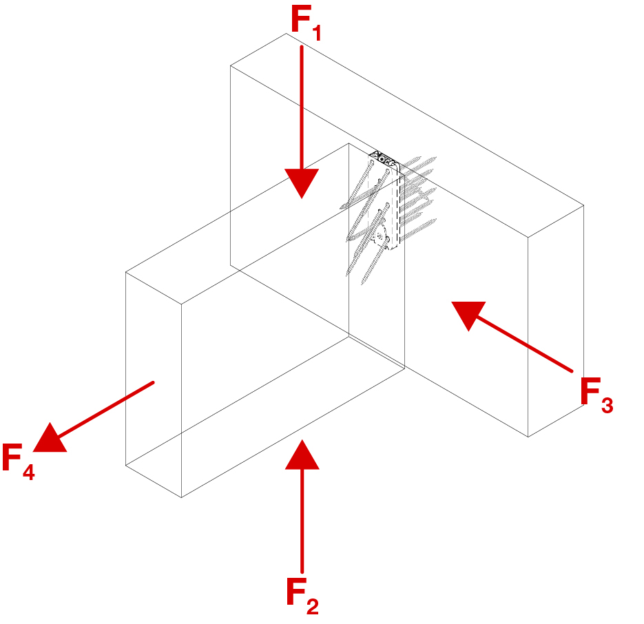 Zur Aufnahme abhebender Lasten, lassen sich vom Nebenträger aus, zwei Vollgewindeschrauben durch den Verbinder in den Hauptträger / Stütze einbringen.