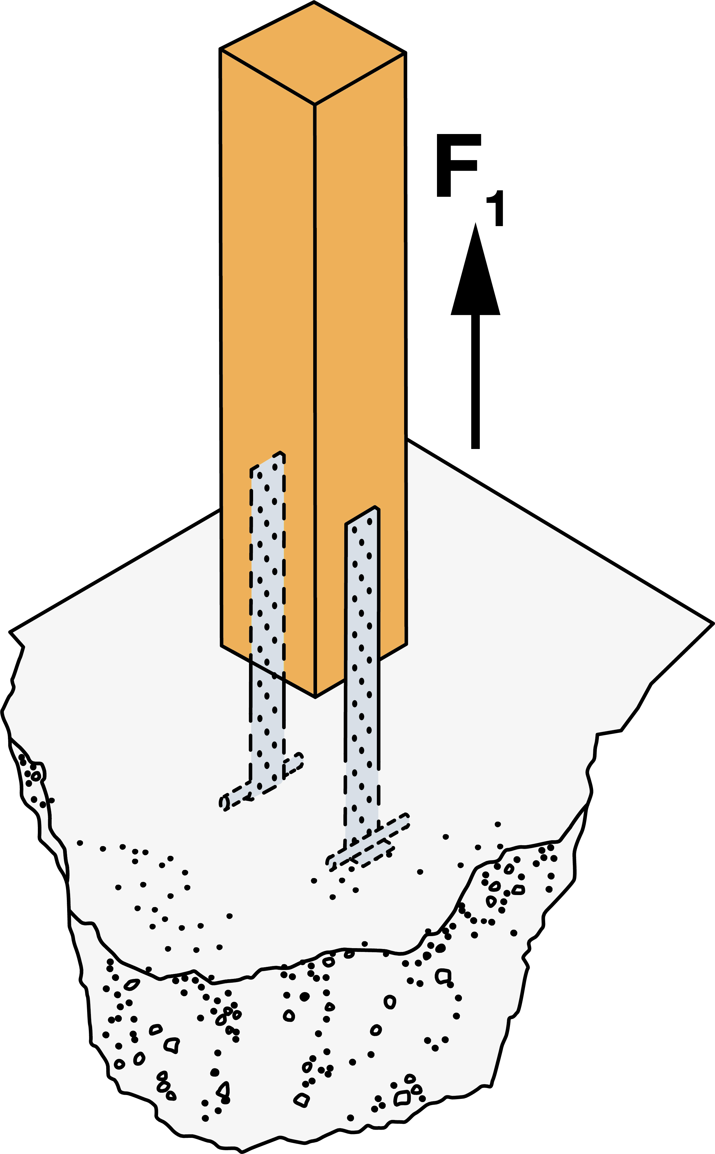 Die BETA Zuganker werden als Zugverbindung von Holzbauteilen an Beton verwendet. Die Anbindung an die Stütze erfolgt mit CNA Kammnägeln oder CSA Schrauben. Der Zuganker muss mindestens 100 mm tief einbetoniert und zur vollen Verankerung
